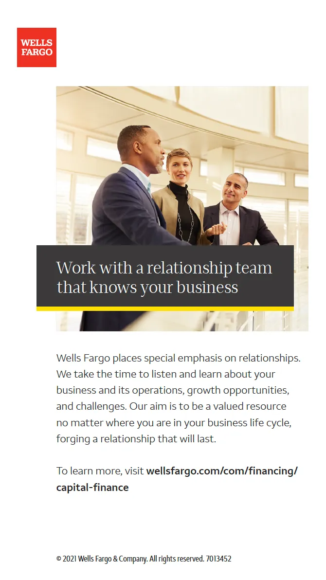 Companies looking to maximize credit availability can turn to Wells Fargo Capital Finance for flexible, innovative financing. In an evolving industry, we bring a long-standing commitment of helping companies access the financing they need to meet their ever-changing goals.