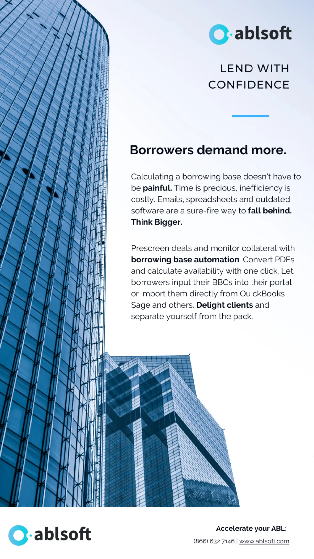 ABLSoft helps asset-based lenders and factors maximize efficiency with intelligent automation. Our Cloud lending platform, continues to pioneer and simplify loan and invoice management. From seamless BBC processing, to tailored covenants, to one-click reporting - our mission is to help lenders grow with confidence.