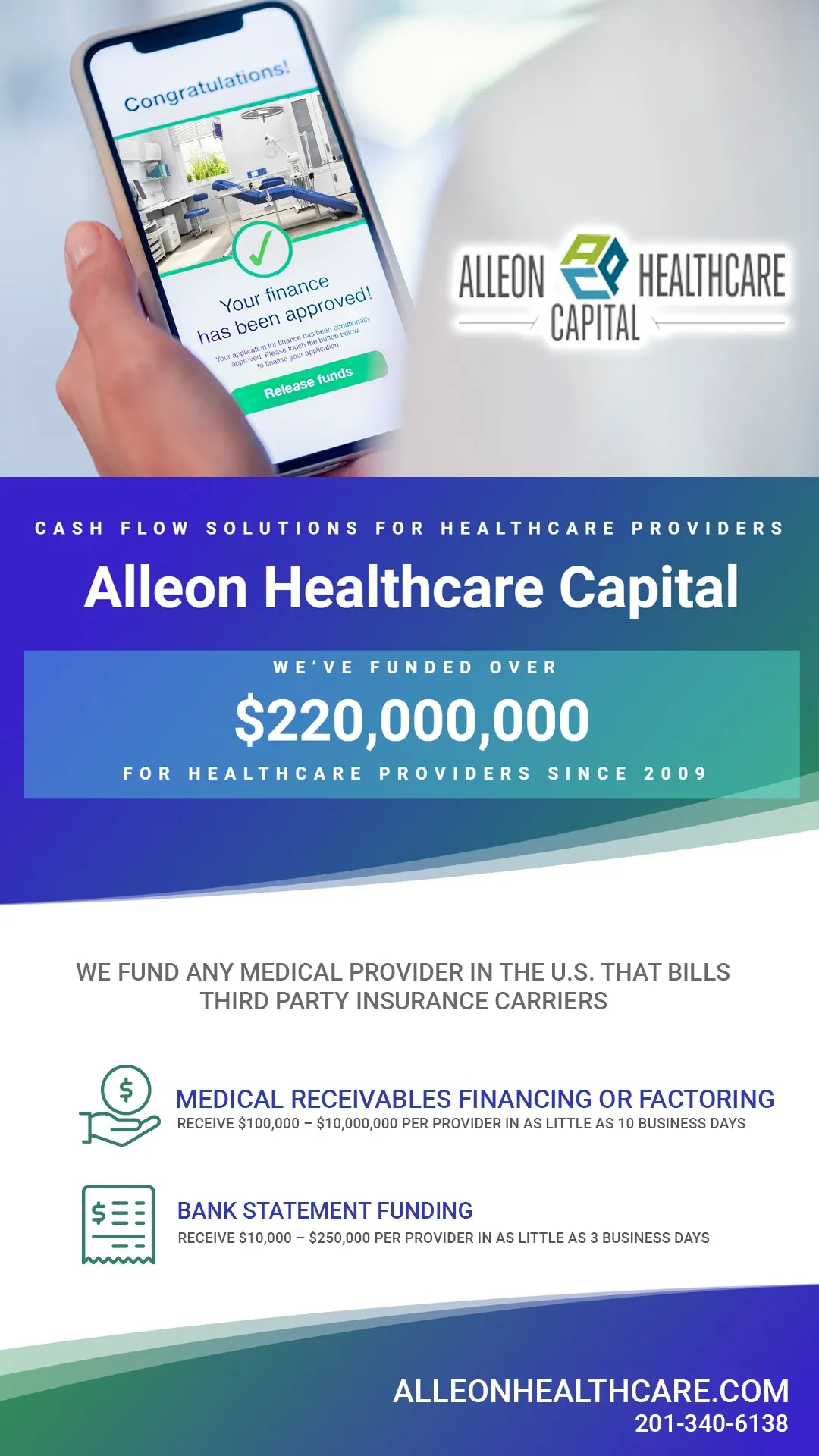 Alleon Healthcare is a privately held specialty finance company focused on providing cash flow solutions and medical receivables financing to healthcare providers in the U.S. The financing products we offer allow our clients to stabilize cash flow, hire new staff, take on more patients, open new medical offices, or deal with special situations such as tax liens or Medicare audits. Our team is well-versed in medical billing and collection services and attempts to resolve our clients’ needs such that they focus less on revenue cycle management and more on providing quality healthcare.