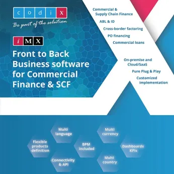 iMX is the global, powerful and flexible IT solution that provides an all-in-one package for any kind of commercial finance activity: factoring (traditional/reverse/domestic/international/etc.), invoice discounting, ABL, supply chain finance, leasing, and credit insurance. With full multi-lingual and multi-currency abilities, and based on the latest available technologies, iMX includes all the most advanced business functionalities to cover the needs of a commercial finance company. It also includes native integration of all the tools needed to improve global productivity like Extranet, Telephony, Imaging and a decisional environment.