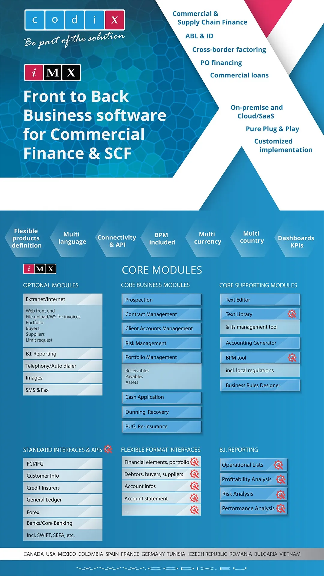 CODIX now operates in 12 countries – USA, France, Bulgaria, Canada, Tunisia, Vietnam, Mexico, Spain, Germany, Czech Republic, Romania and Colombia. Company's top-level multi-disciplinary team of over 750 professionals is dedicated to the implementation, maintenance and constant evolution of the company’s unique product – iMX. The software is currently used in 28 languages by more than 50.000 users in 50+ countries.