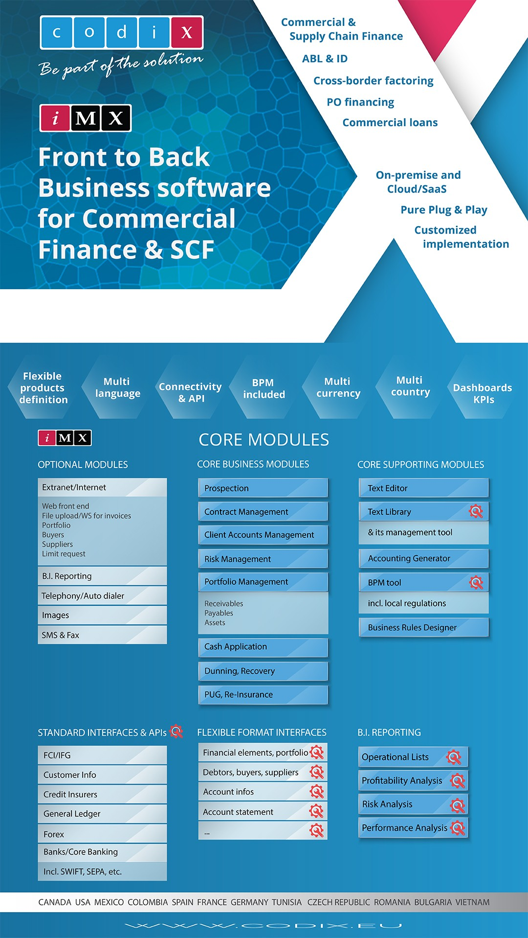 iMX is the global, powerful and flexible IT solution that provides an all-in-one package for any kind of commercial finance activity: factoring (traditional/reverse/domestic/international/etc.), invoice discounting, ABL, supply chain finance, leasing, and credit insurance. With full multi-lingual and multi-currency abilities, and based on the latest available technologies, iMX includes all the most advanced business functionalities to cover the needs of a commercial finance company. It also includes native integration of all the tools needed to improve global productivity like Extranet, Telephony, Imaging and a decisional environment.