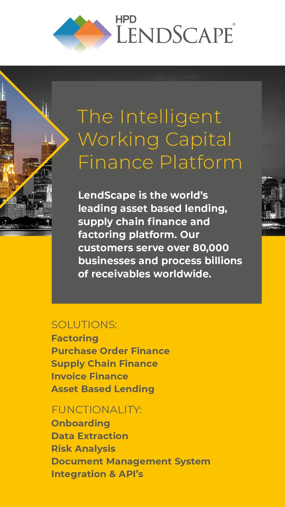 HPD LendScape is an award-winning technology vendor for secured lending and working capital finance. Our LendScape™ Platform is a cloud first, business process management solution for Asset Based Lending, Supply Chain Finance, Factoring, and more. Today, LendScape is deployed by over 150 finance providers in 50 markets across North America, the UK, EMEA, APAC, and Africa. Our clients include some of the worlds’ most notable brands in banking and financial services.