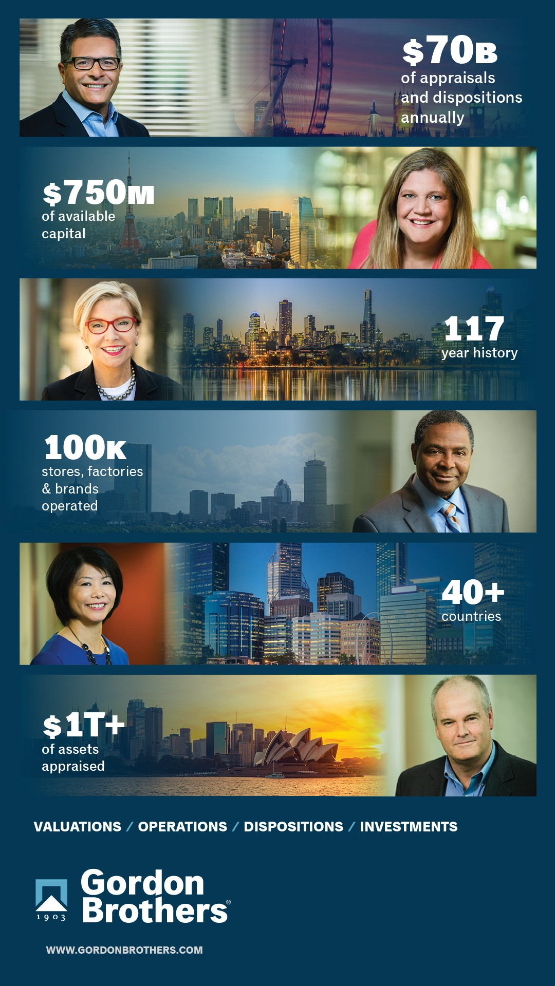 Since 1903, Gordon Brothers has helped lenders, operating companies, advisors, and investors move forward through change. The firm brings a powerful combination of expertise and capital. With services in valuations, dispositions, operations, and investments, Gordon Brothers provides customized solutions on an integrated or standalone basis for clients at all points in the business lifecycle. Whether to fuel growth or facilitate strategic consolidation, Gordon Brothers works across industries and around the world to put assets to their highest and best use. Gordon Brothers conducts more than $70 billion worth of dispositions and appraisals annually. Gordon Brothers is headquartered in Boston, with 25 offices spread across five continents.