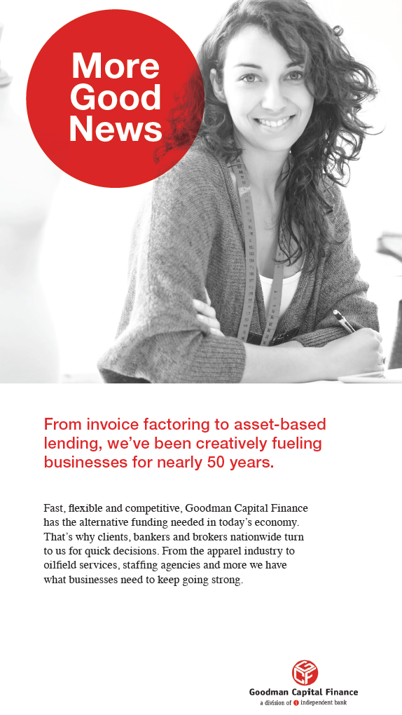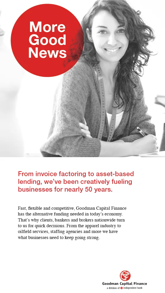 Goodman Capital Finance (formerly Goodman Factors), based in Dallas, Texas, has been one of the nation’s oldest, most trusted, and innovative providers of factoring services for nearly 50 years strong. Goodman’s expertise extends to a variety of industries, including consumer influenced brands and products, staffing, transportation, and business services. The name change to Goodman Capital Finance in 2019 was implemented to reflect its broader product offering into asset-based and specialty lending.