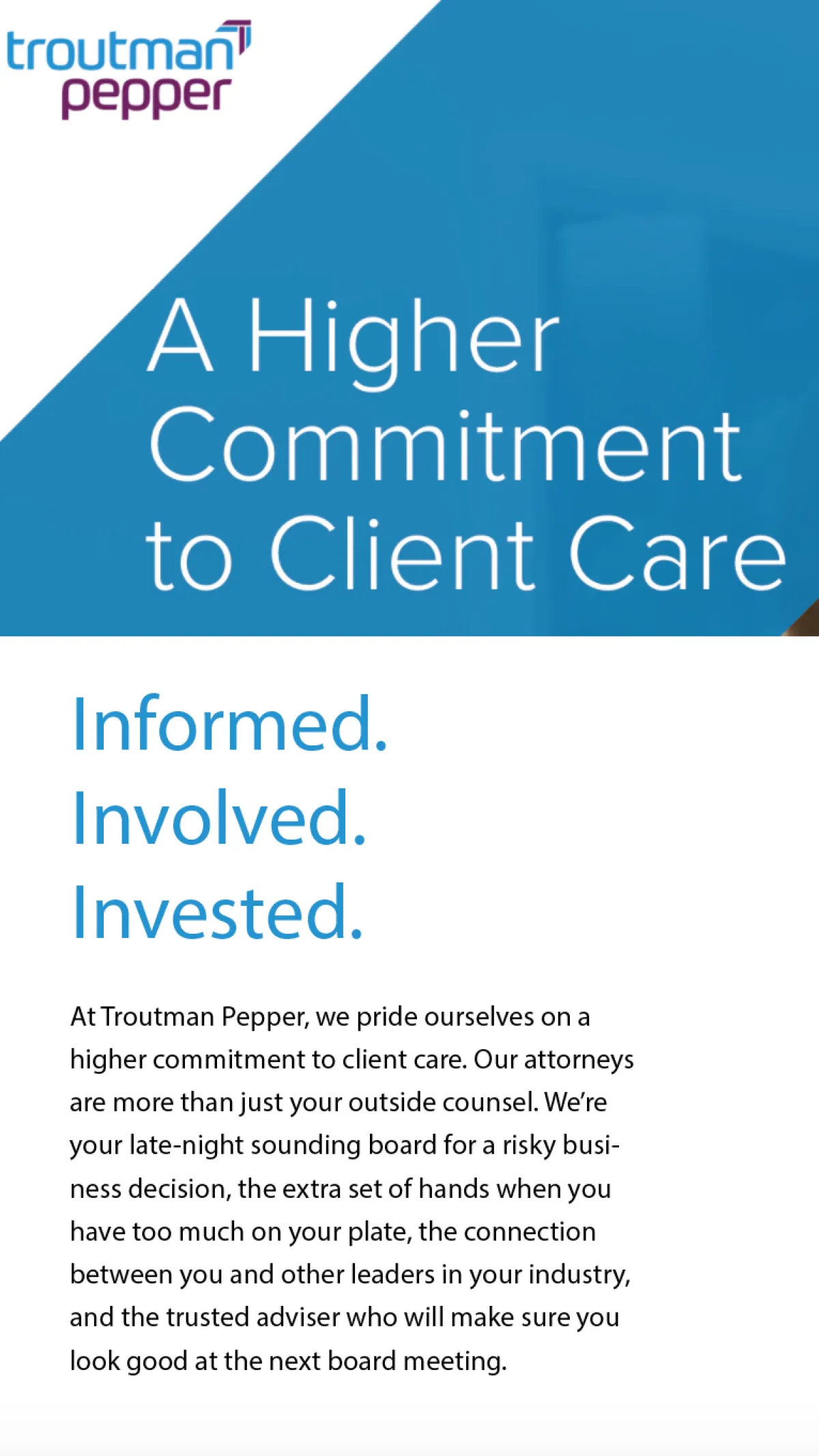 Troutman Pepper is a national law firm known for its higher commitment to client care. With more than 1,100 attorneys in 23 U.S. cities, we combine the resources of a large firm with the personal engagement of a trusted adviser and partner, viewing our relationship with our lender clients as a partnership rather than merely a transactional relationship. We guide clients through a wide variety of sophisticated financing transactions across industries, from initial documentation through evaluating and implementing restructuring and workout strategies (both in and outside of bankruptcy). We represent both banks and direct lenders in single-lender and multi-lender transactions across the entire spectrum of secured asset-based loan transactions, including working capital facilities, acquisition financings and lender finance.