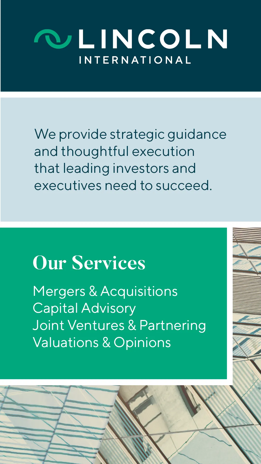 We are trusted investment banking advisors to business owners and senior executives of leading private equity firms and public and privately held companies around the world. Our advisory services include mergers and acquisitions and capital markets advisory for the mid-market. We also provide valuations and fairness opinions and joint ventures advisory services. As one tightly integrated team of more than 600 professionals across 16 countries, we offer an unobstructed perspective, backed by superb execution and a deep commitment to client success. With extensive industry knowledge and relationships, timely market intelligence and strategic insights, we forge deep, productive client relationships that endure for decades. Connect with us to learn more at www.lincolninternational.com.