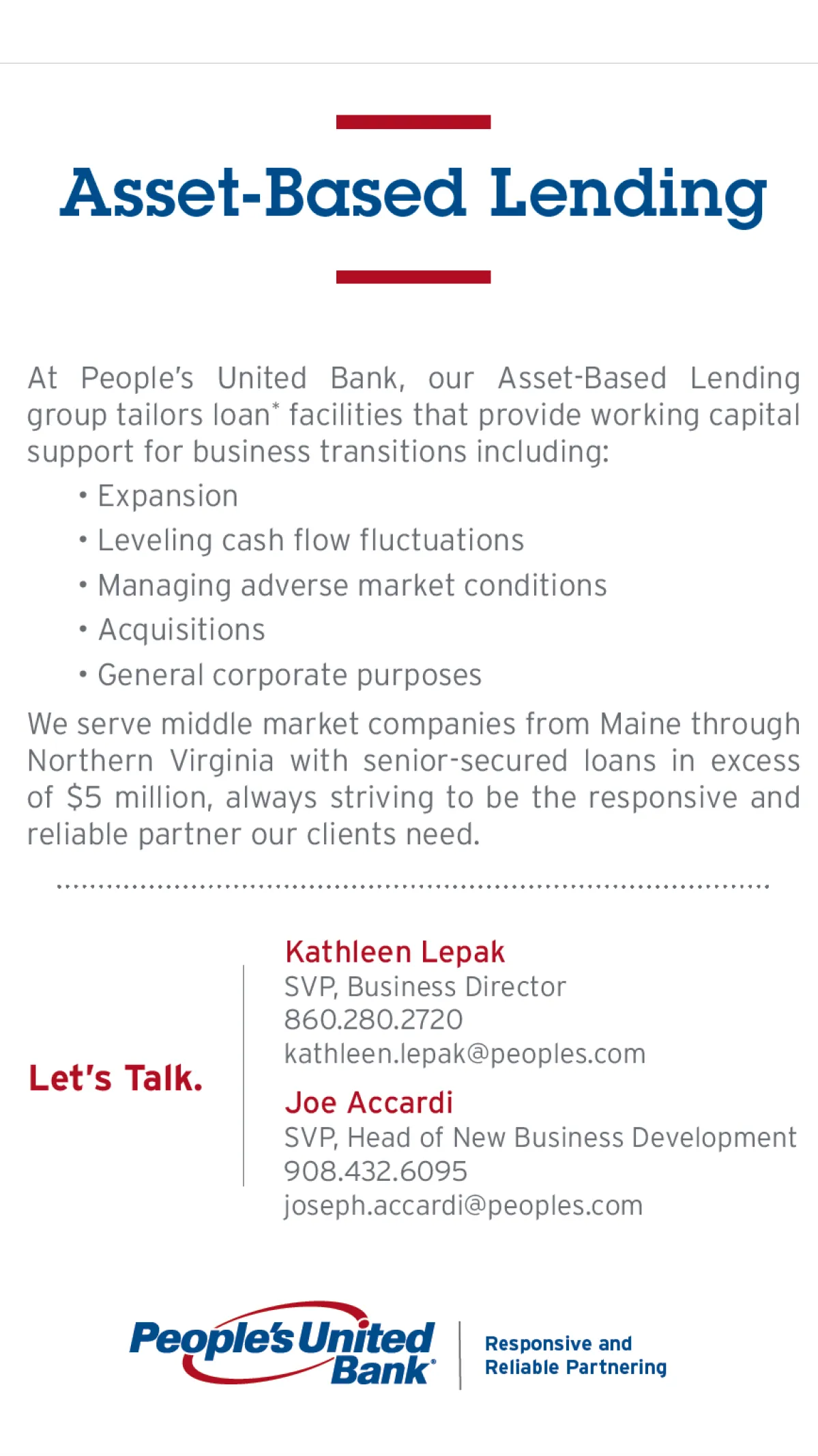 The People’s United Bank Asset-Based Lending group issues loans to our clients structured to provide working capital support for business transitions: to expand, to level cash flow fluctuations, to manage adverse market conditions, to acquire companies, and for general corporate purposes. We serve middle market companies from Maine through Northern Virginia with senior-secured loans in excess of $5 million, always striving to be the responsive and reliable partner our clients need.