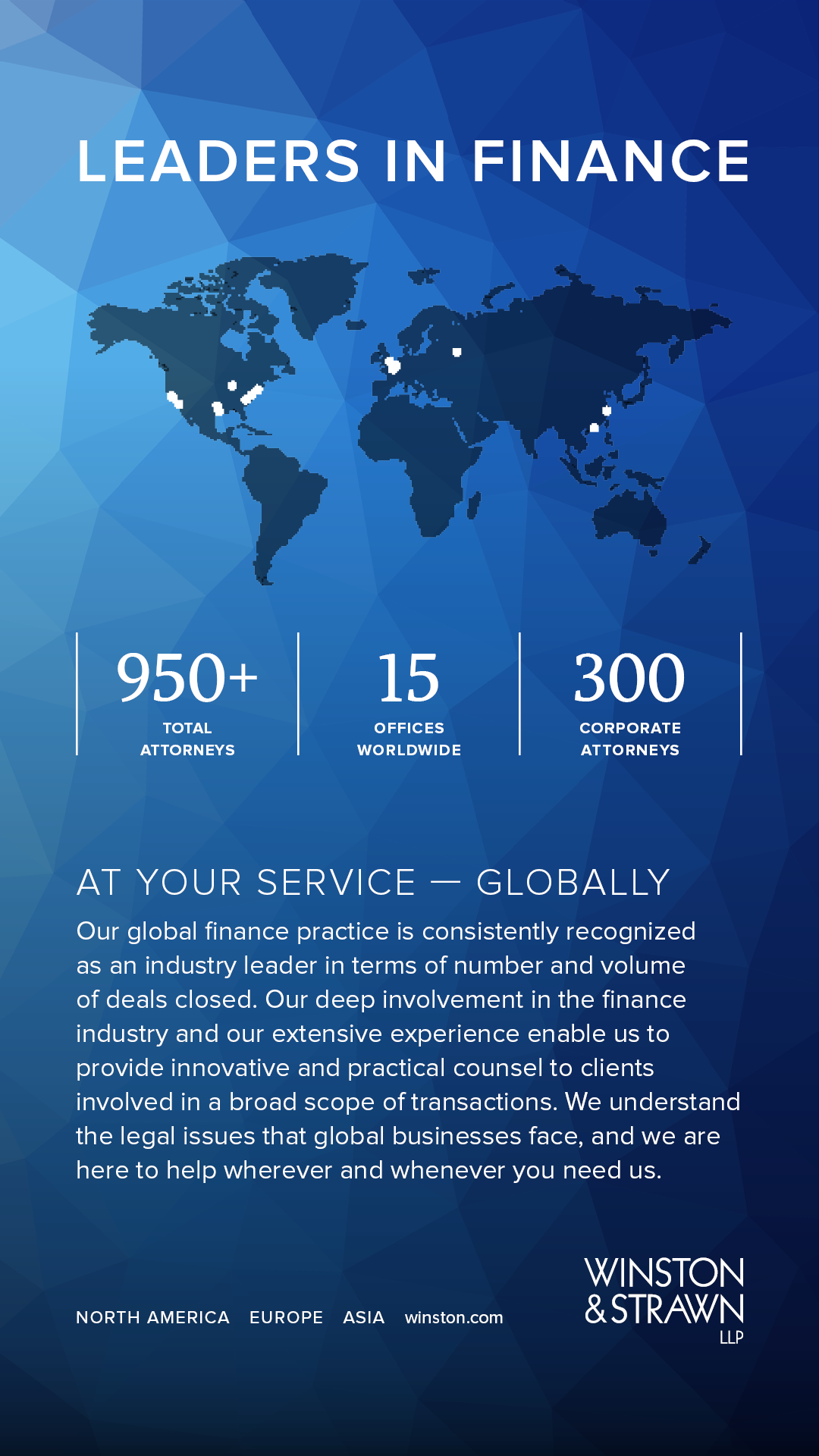 Winston & Strawn LLP is a full-service, international law firm with more than 900 attorneys in 15 offices. Our Global Finance Practice is consistently recognized as an industry leader and includes attorneys with substantial experience in a broad range of transactions covering all segments of the debt markets. Our clients include leading domestic and international funding sources that provide senior, subordinated, secured, and unsecured loans; institutional investors that participate in the senior debt market; equity sponsors; and borrowers. Winston attorneys have extensive experience representing clients in cross-border ABL and leveraged finance matters that have multicurrency components.